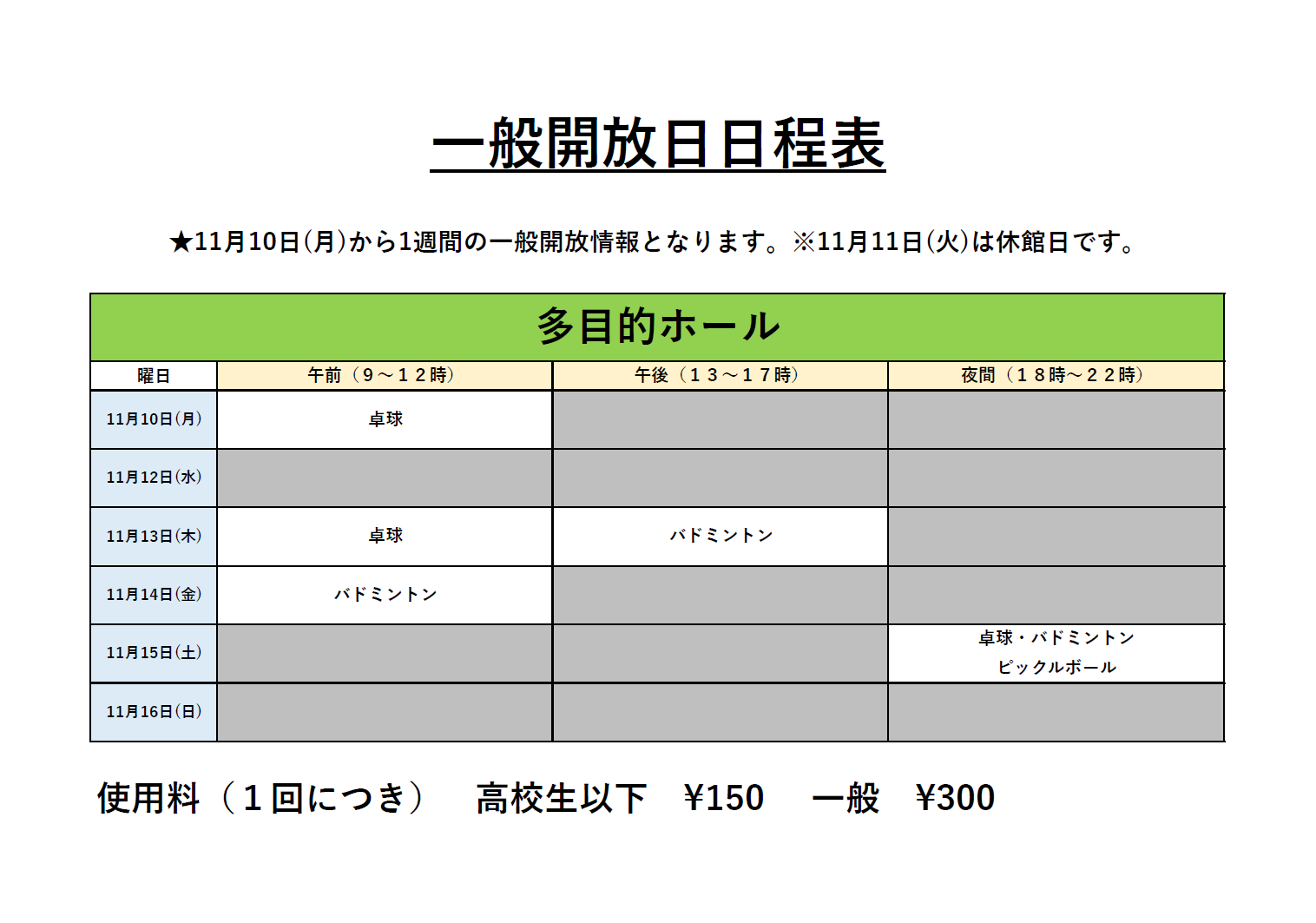 また、曜日・時間帯によって出来る競技は決まっていますが、