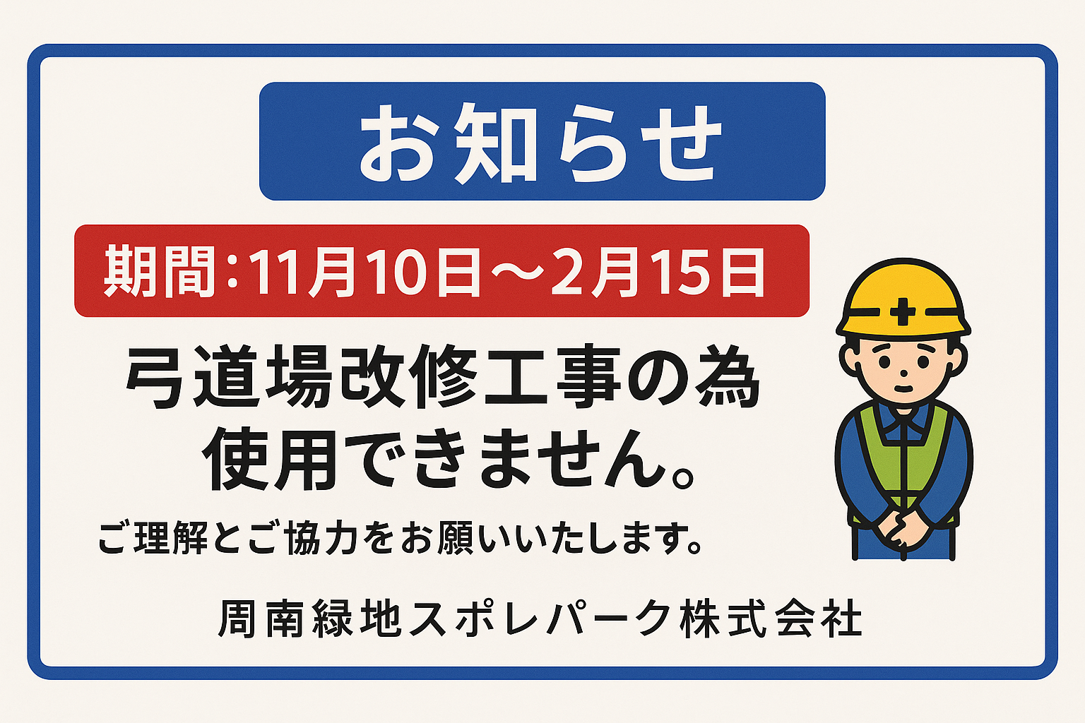 お知らせWhat's New HOME >お知らせ お知らせお知らせ一覧 弓道場改修工事のお知らせ(11/10~) 2025年10月19日 平素より周南緑地公園をご利用いただきありがとうございます。弓道場の改修工事に伴い、以下の期間はご利用いただけません。期間:2025年11月10日(月)~2026年2月15日(日) ※用具等は事前に撤去をお願いいたします。ご利用の皆さまにはご不便をおかけしますが、ご理解とご協力をお願いいたします。 アーカイブ 2025年 2024年 2023年