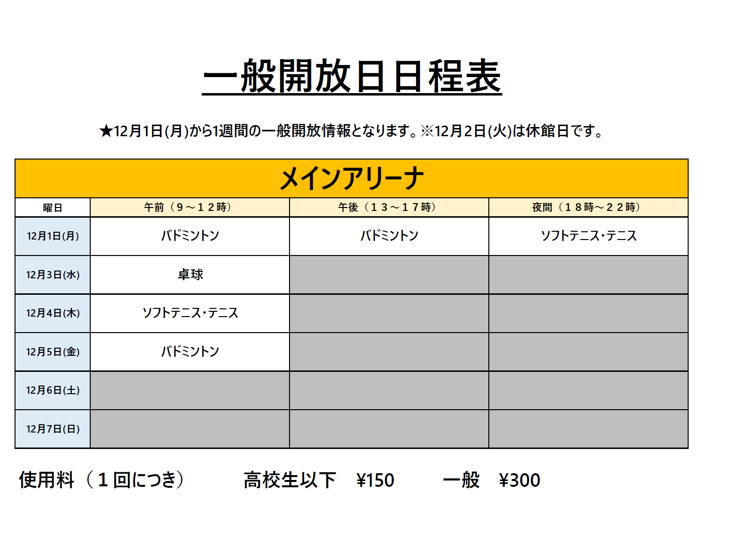次週の一般開放及び、可能種目のご連絡です。