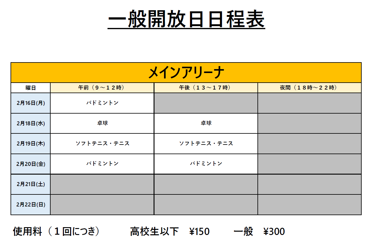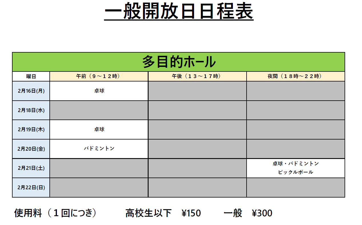 また、曜日・時間帯によって出来る競技は決まっていますが、