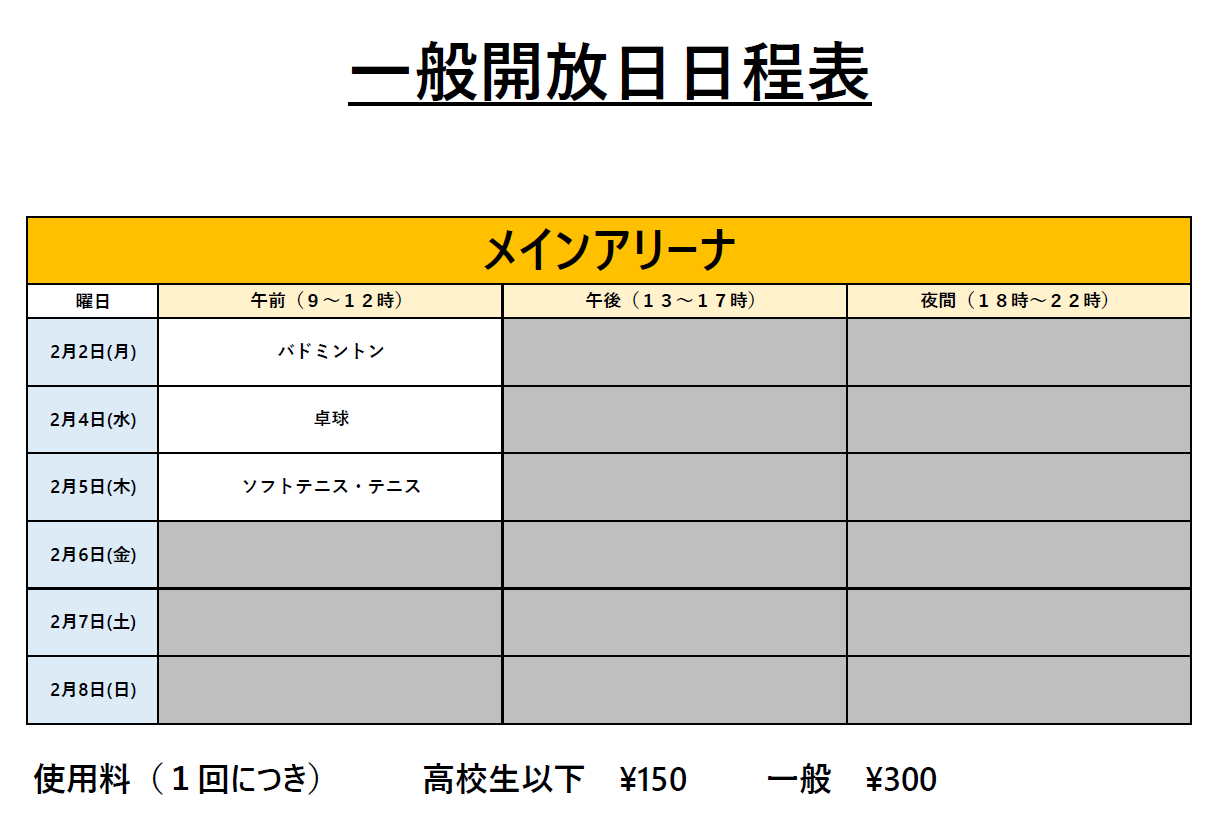 次週の一般開放及び、可能種目のご連絡です。